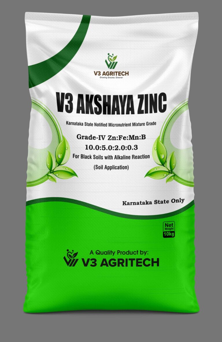 V3 Akshaya Zinc is sulphate-based micronutrient mixture soil application-based fertilizer formulated to correct micronutrient deficiencies and support balanced plant nutrition. It is a Grade-IV micronutrient mixture containing Zn, Fe, Mn, and B in the proportion of 10.0: 5.0: 2.0: 0.3, for Black soils with Alkaline reaction, for better nutrient availability and absorption. It supplies essential trace elements in readily available forms, helping plants grow healthier, greener, and more productive.