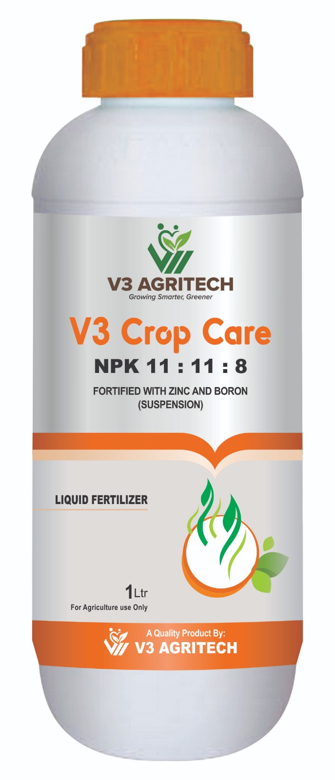 V3 Crop Care is a balanced liquid fertilizer containing nitrogen, phosphorus, and potassium (11:11:8) fortified with zinc and boron micronutrients. It is developed from Bio Polymer Technology (BPT). It provides both major and essential trace nutrients required for healthy plant growth, improved flowering, and better crop yield. The suspension form ensures quick absorption and fast nutrient availability to plants.